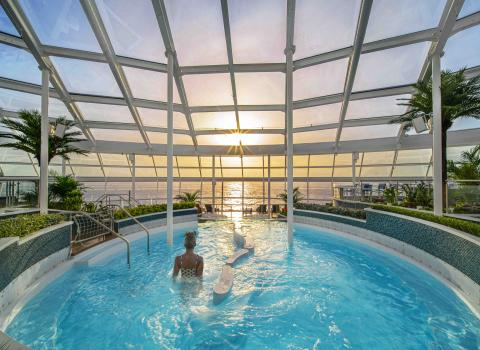 There are seven suite categories (not including Junior Suites), all of which have access to the new super-duper Suite Lounge and Coastal Kitchen, which have replaced the Viking Crown Lounge on Deck 17. In addition to a concierge, suite passengers receive a number of perks, including a nightly cocktail "hour" with free drinks from 5 to 8:30 p.m.; priority check-in; reserved prime seating in the main theater; access to full breakfast, lunch and dinner menus for in-cabin dining; luxury bathrobes and complimentary pressing for formal nights; access to a private sun deck with loungers and cabanas; an exclusive reception with senior officers; and free dining in the Suites-only Coastal Kitchen.