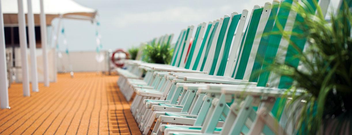 When the weather's fine, you can grab a drink from the Lido Bar out on Sun Deck before retiring to one of the many sun chairs to soak up the scenery and sunshine.