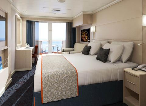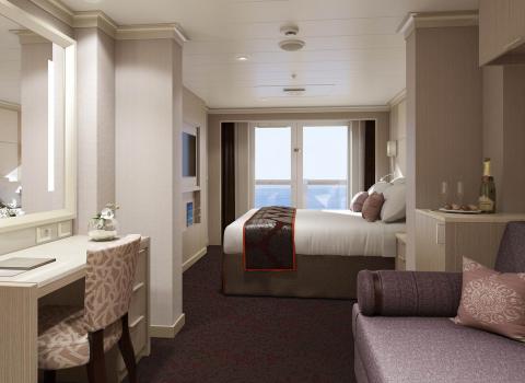 Step into a private haven characterized by light, space and elegance. Our interior designer, guided by guest feedback, was given the freedom to completely reimagine staterooms aboard. The result: welcome modern touches such as bedside USB ports and frameless shower glass doors, as well as luxe appointments like customized wooden cabinetry. 2 lower beds convertible to 1 queen-size bed, shower, sitting area, private verandah, floor-to-ceiling windows. Approximately 260–356 sq. ft. including verandah.