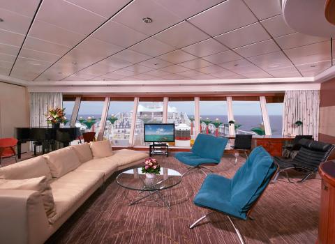 With room for up to three guests, these staterooms have two lower beds that convert into a queen-size bed and a pull out sofa to accommodate one more. Along with a sitting area, floor-to-ceiling glass doors and a private balcony with an amazing view.