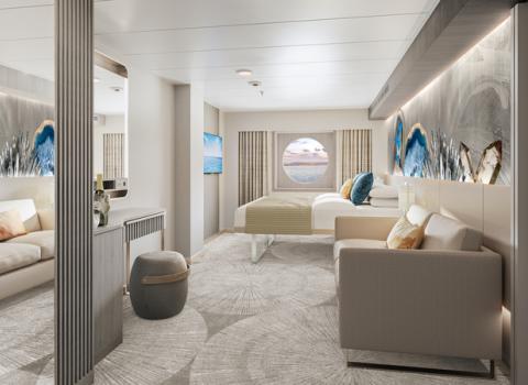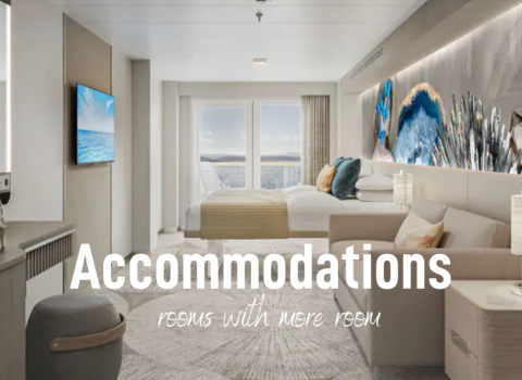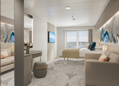 These Balcony Staterooms have room for up to three guests and feature floor-to-ceiling glass doors that open to a private balcony with an incredible view. They include a separate bathroom with shower, two lower beds that convert into a queen-size bed, a sitting area and additional bedding to accommodate one more.