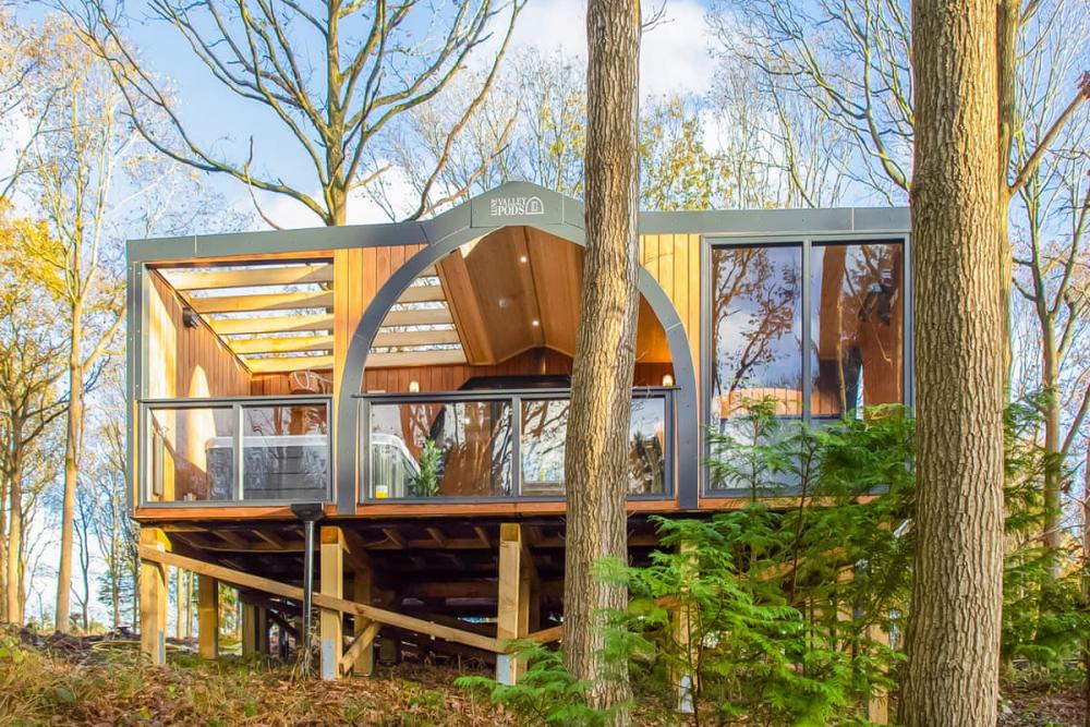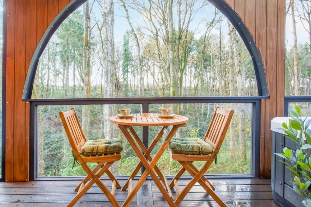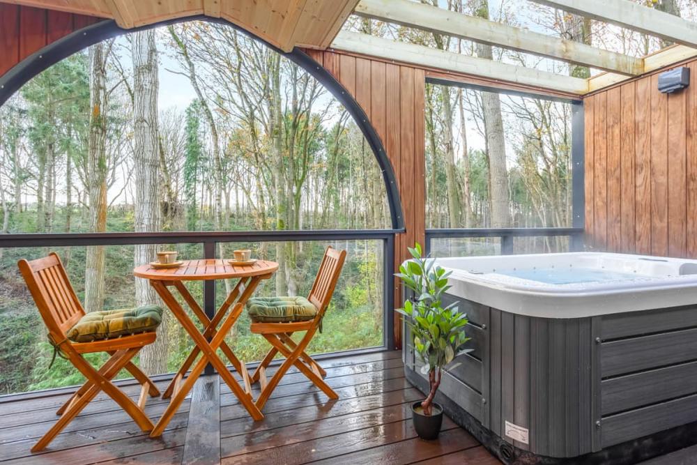 - Private hot tub and heated balcony in a tranquil woodland setting