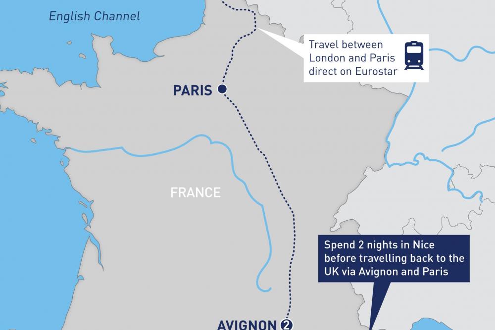 Explore Provence and the French Riviera by rail with stays in Aix-en-Provence, Avignon and Nice.